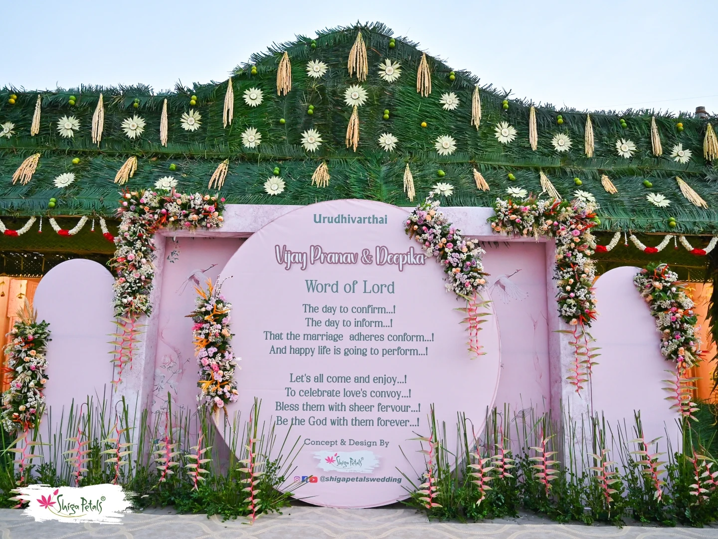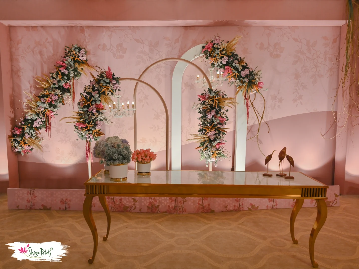This engagement unfolded inside a space reimagined as a blooming courtyard. Spanish-inspired pillars, arched frames, and a warm floral palette guided the visual language. Every element drew from nature. Layered creepers. Banyan saplings. Ceremonial trees.