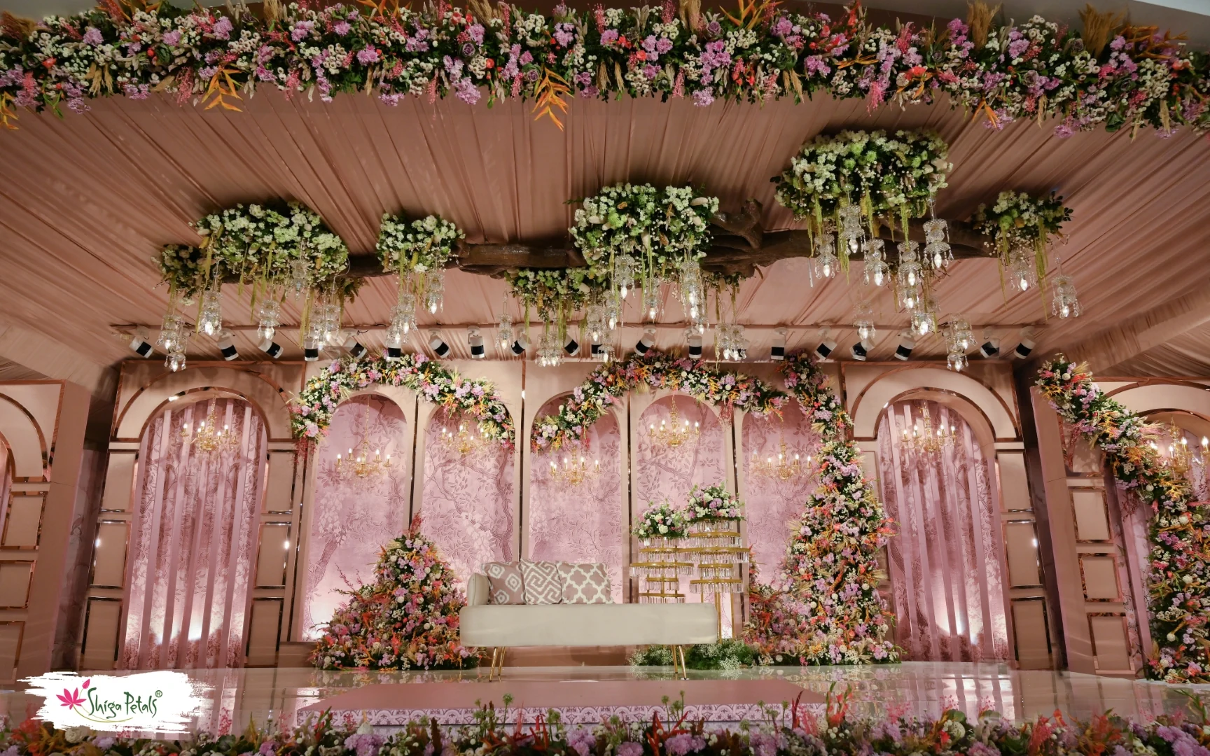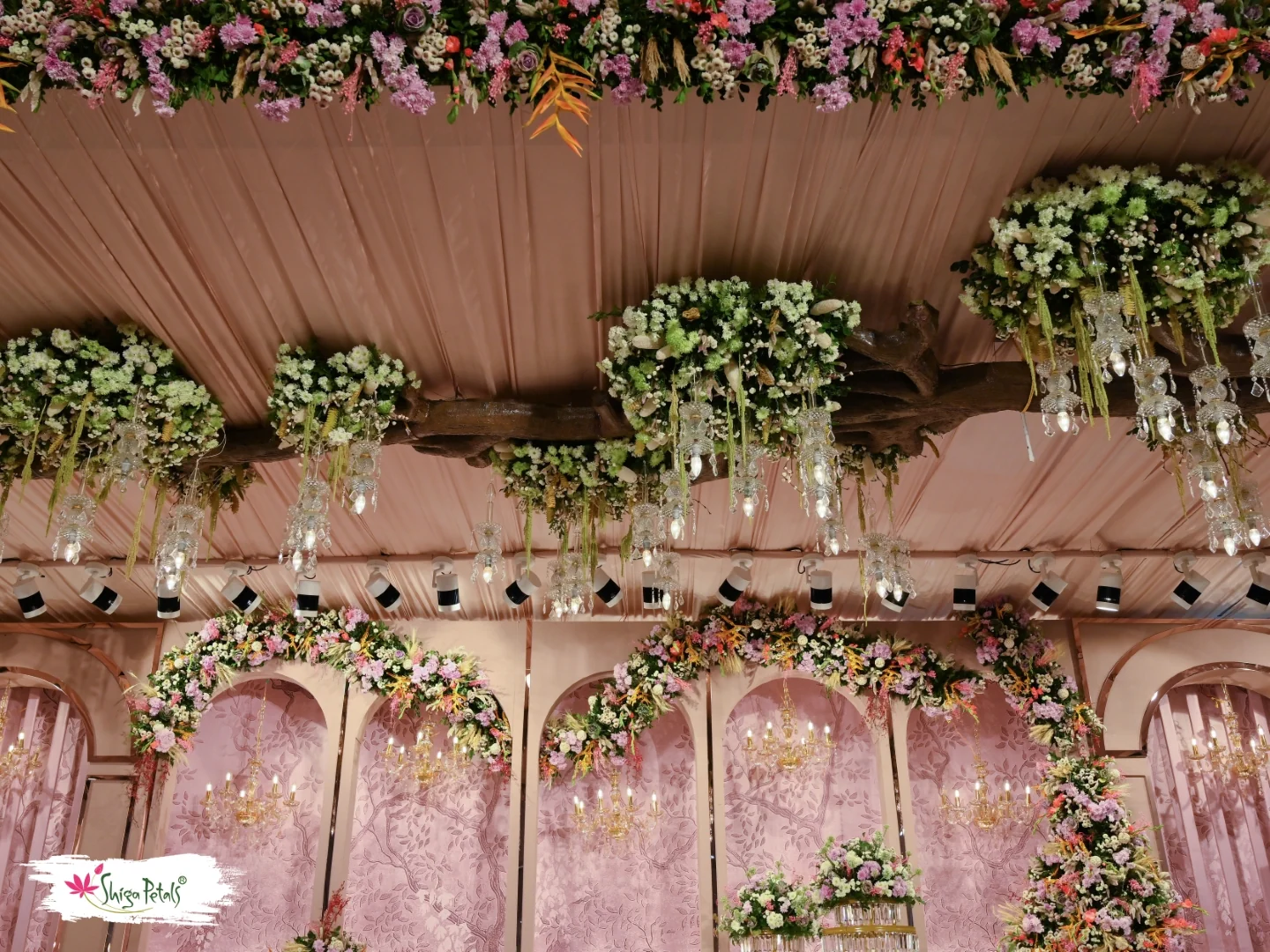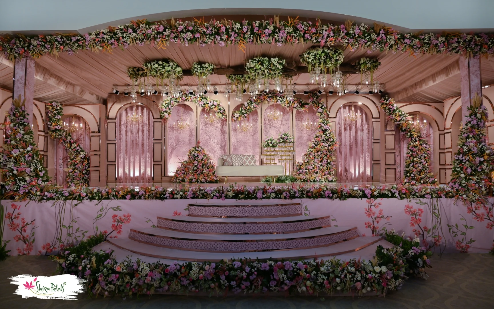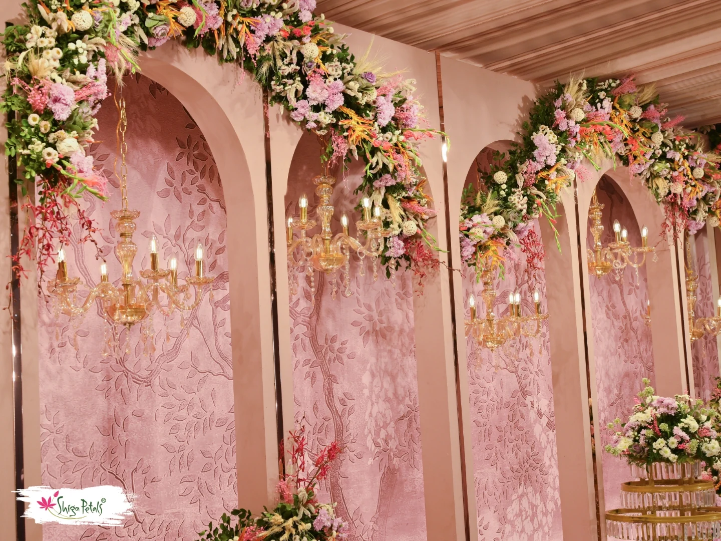 Guests walked into a floral pathway that opened to soft arches, garden walls, and warm ambient tones. The space transitioned gently from daylight rituals to a serene evening celebration, held in quiet elegance.
